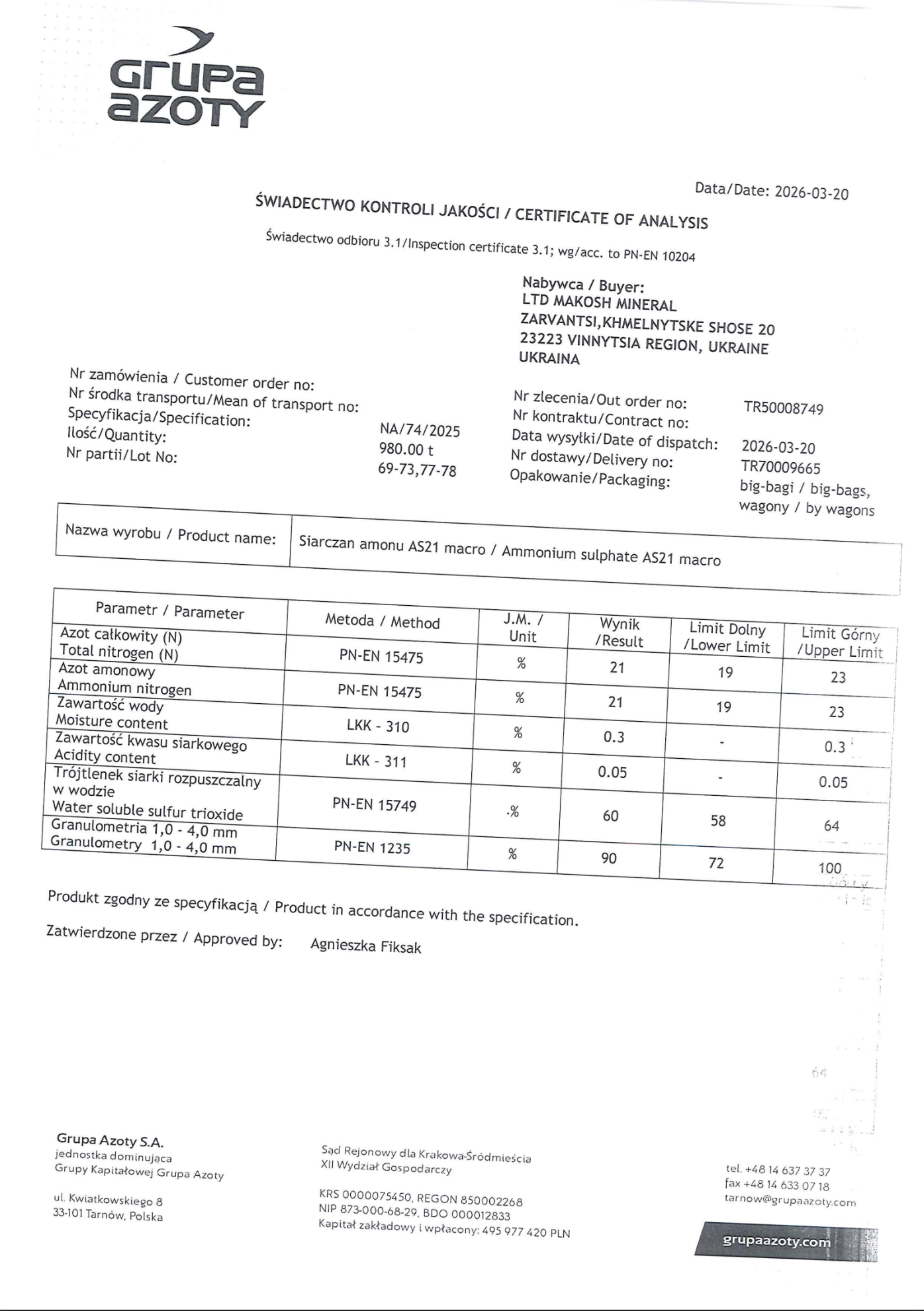 • Fast dissolution and stability. The crystalline form of the fertilizer ensures instant dissolution in water, contributing to the rapid absorption of nutrients by plants. In addition, AS 21 macro ammonium sulfate is less prone to caking, which makes it easy to store and use.