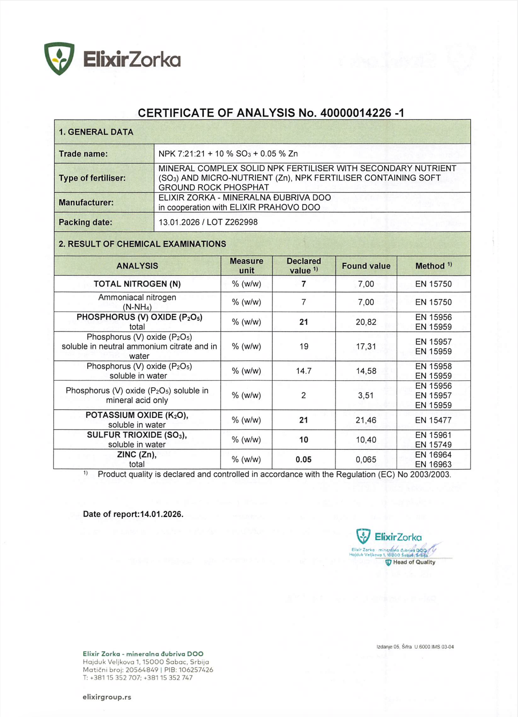 - 21%Phosphorus pentoxide (P₂O₅), total