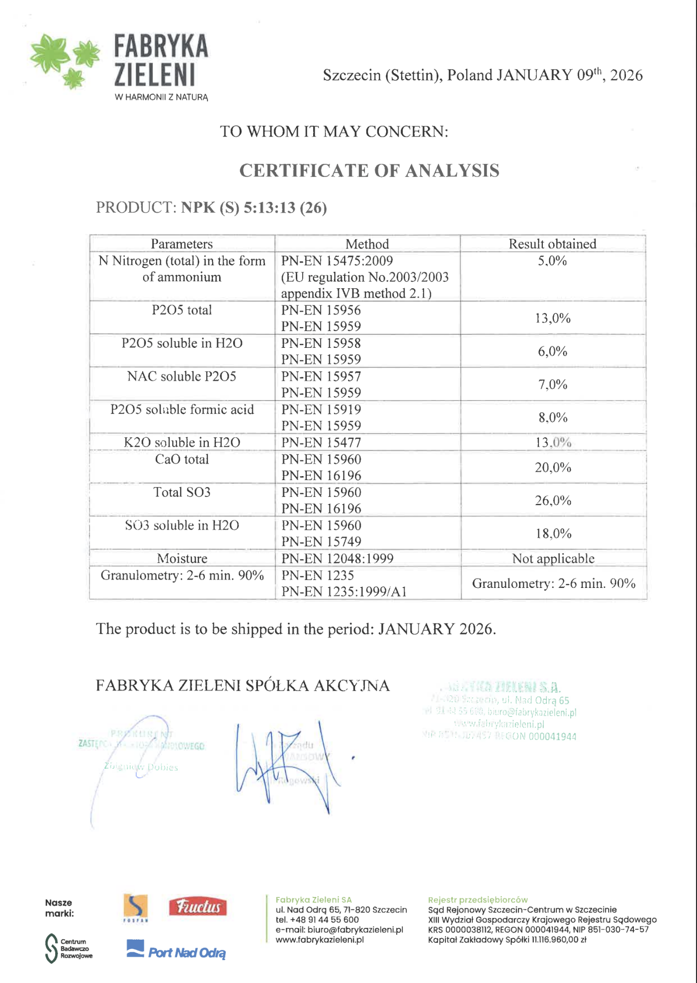 - 13% Phosphorus pentoxide (P₂O₅), total