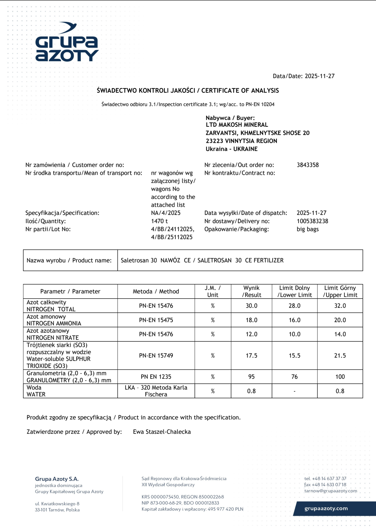 - Optimal ratio of nitrogen and sulfur for spring fertilization. Ideal for winter cereals and rapeseed, promoting a quick start to the growing season after winter and ensuring efficient nutrient absorption.