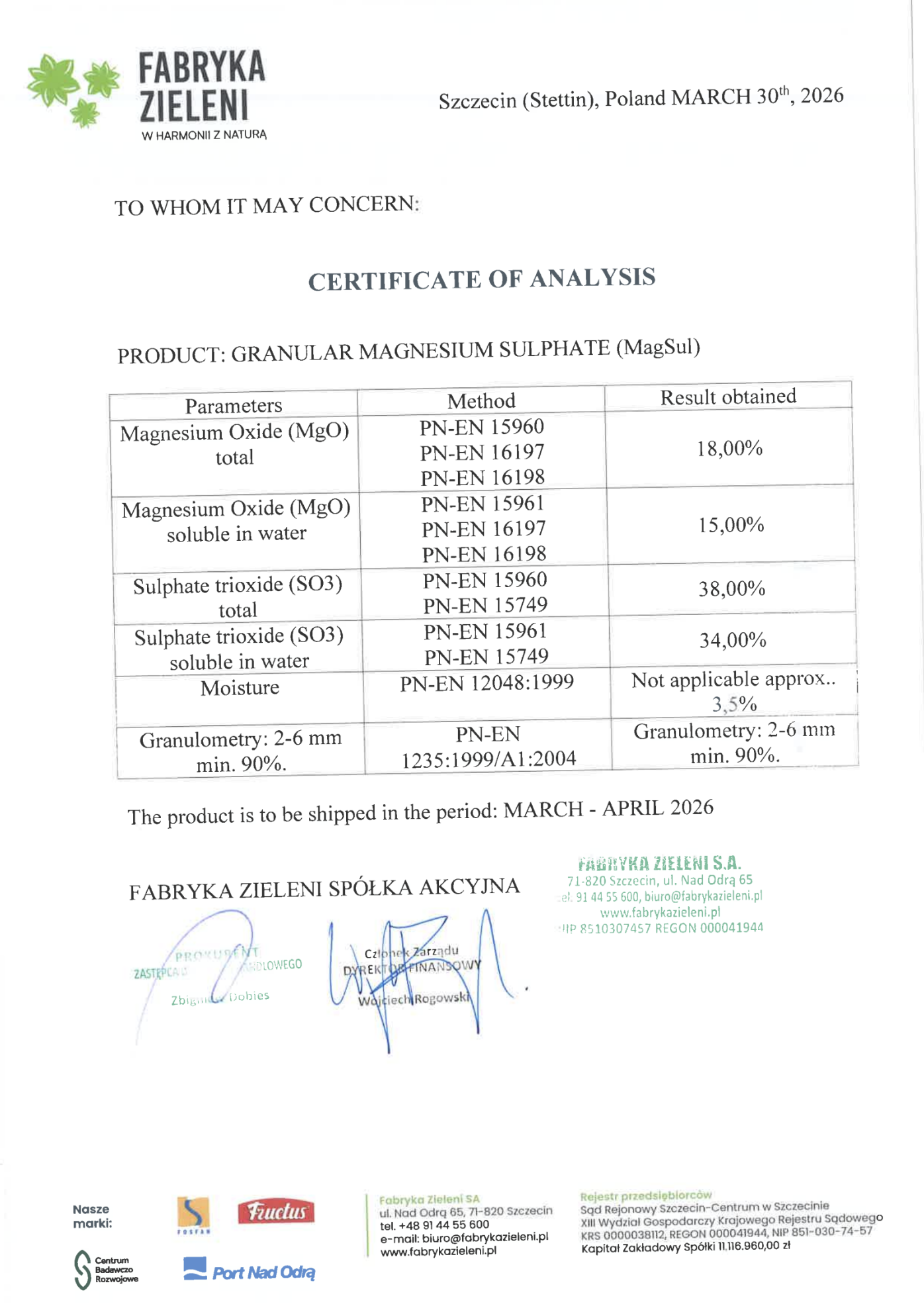 • Оптимальне сірчане та магнієве живлення для високої врожайності. Добриво забезпечує баланс ключових елементів, підтримуючи стабільний розвиток культур та їхню стійкість до стресових умов.