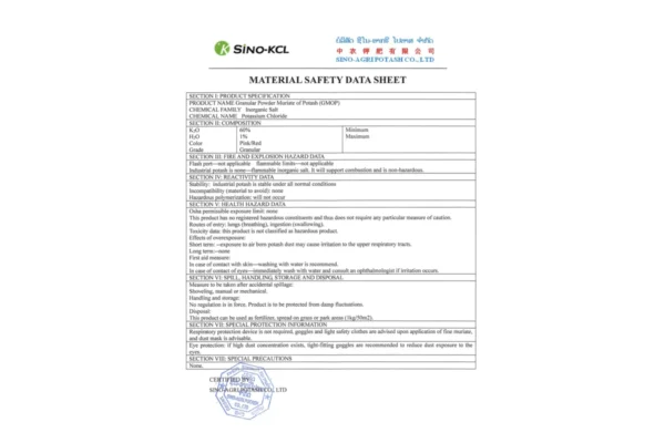 Найвищий вміст серед калійних добрив, що забезпечує інтенсивне живлення рослин і високу ефективність.