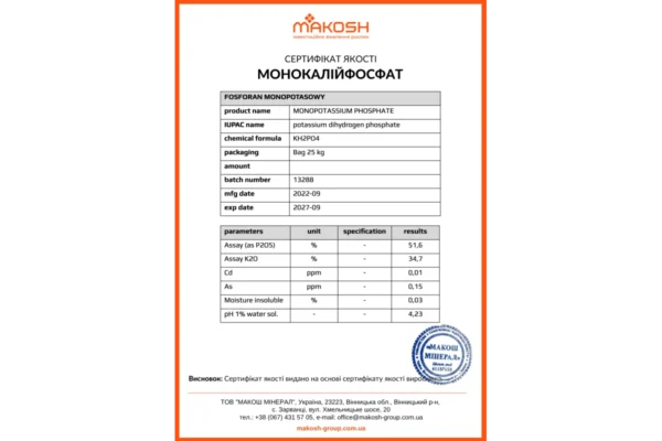- Високий ступінь розчинності для ефективного внесення. Добриво швидко розчиняється, що гарантує миттєве засвоєння поживних речовин рослинами та максимальну ефективність підживлення.