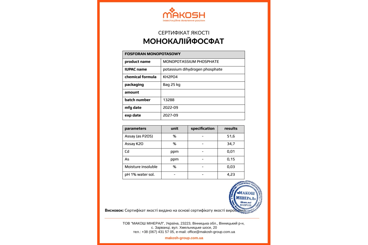 - Висока концентрація фосфору та калію для оптимального живлення. Добриво забезпечує інтенсивне живлення рослин, сприяючи стабільному розвитку кореневої системи та підвищенню продуктивності культур.