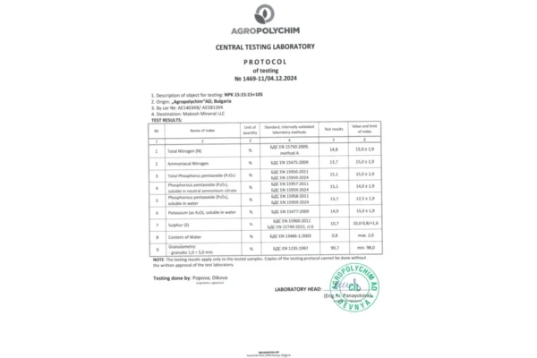 • 15%П'ятиокис фосфору (P₂O₅), загальний