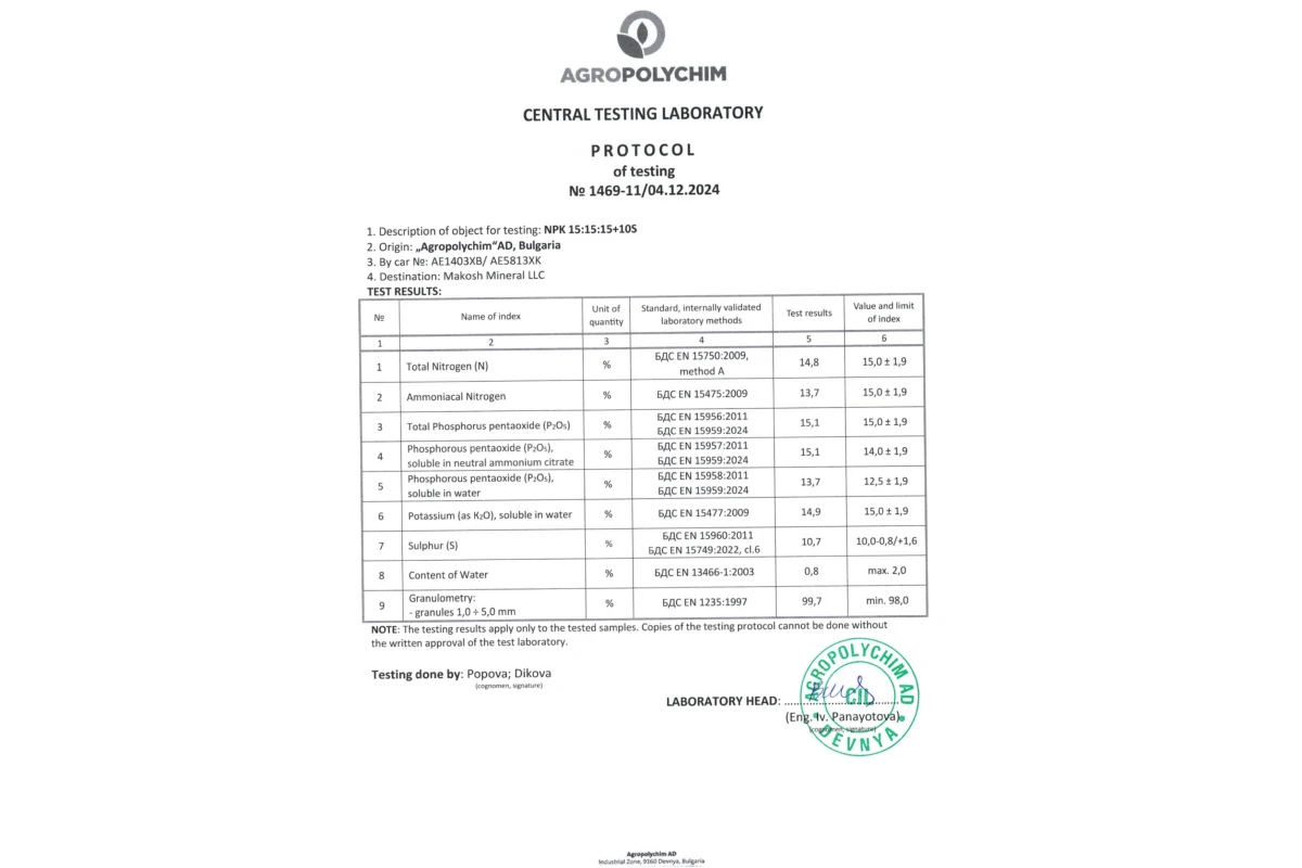 • 15%П'ятиокис фосфору (P₂O₅), загальний