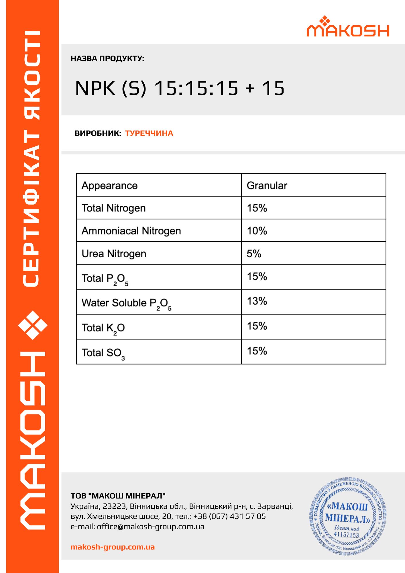 - Комплексне добриво NPK (S) 15:15:15 +15 застосовують для внесення передпосівом та одночасно з висівом насіння у рядок під усі сільськогосподарські культури. Купити добриво нітроамофоска 1 тонна за гуртовою ціною та з доставкою по Україні можна лише в MAKOSH
