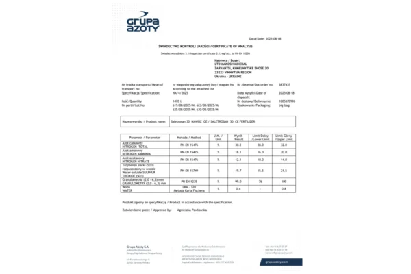 - Оптимальне співвідношення азоту та сірки для весняного підживлення. Ідеально підходить для озимих зернових та ріпаку, сприяючи швидкому старту вегетації після зими та забезпечуючи ефективне засвоєння поживних речовин.