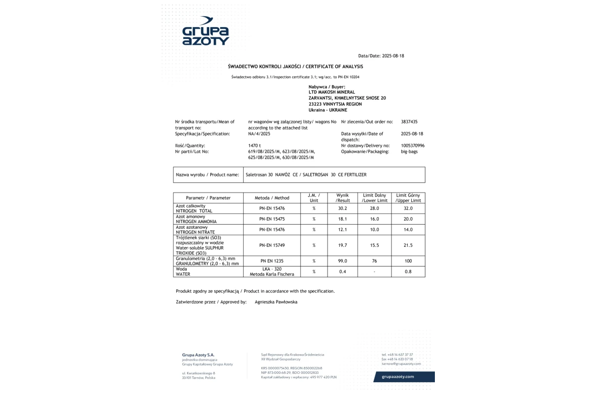 - Оптимальне співвідношення азоту та сірки для весняного підживлення. Ідеально підходить для озимих зернових та ріпаку, сприяючи швидкому старту вегетації після зими та забезпечуючи ефективне засвоєння поживних речовин.