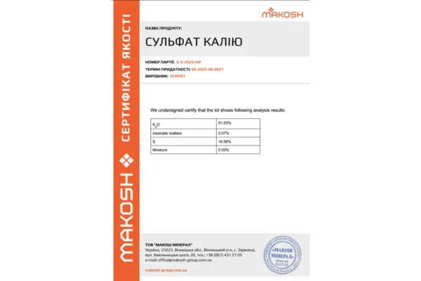 • Кристалічна форма забезпечує зручне застосування, а добре розчинні форми калію та сірки забезпечують швидке засвоєння цих складників рослинами.