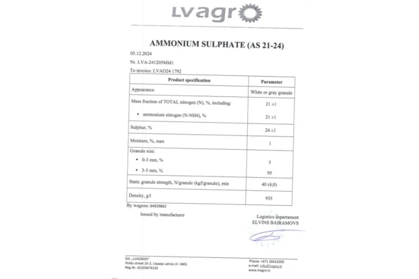 • Надійне постачання азоту для рослин. Амонійна форма азоту залишається доступною для рослин, не вимивається опадами, що дозволяє ефективно використовувати добриво на легких піщаних ґрунтах.