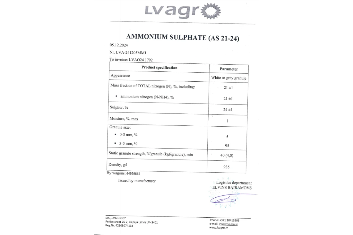 • Надійне постачання азоту для рослин. Амонійна форма азоту залишається доступною для рослин, не вимивається опадами, що дозволяє ефективно використовувати добриво на легких піщаних ґрунтах.
