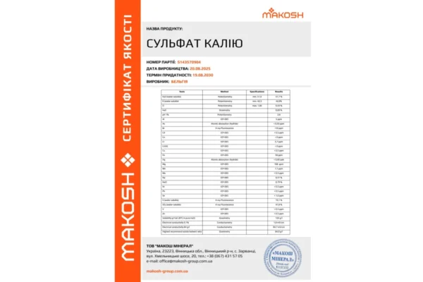 - Безхлорна сульфатна форма калію – максимальна доступність. Завдяки високій розчинності, добриво забезпечує швидке засвоєння калію та сірки, покращуючи живлення рослин без ризику токсичних впливів.