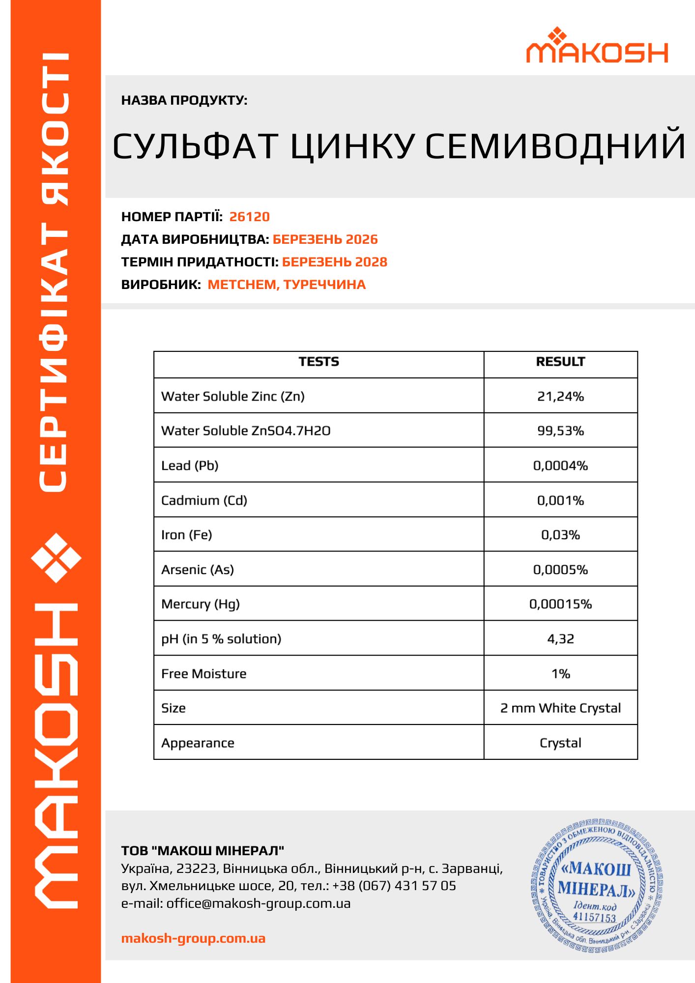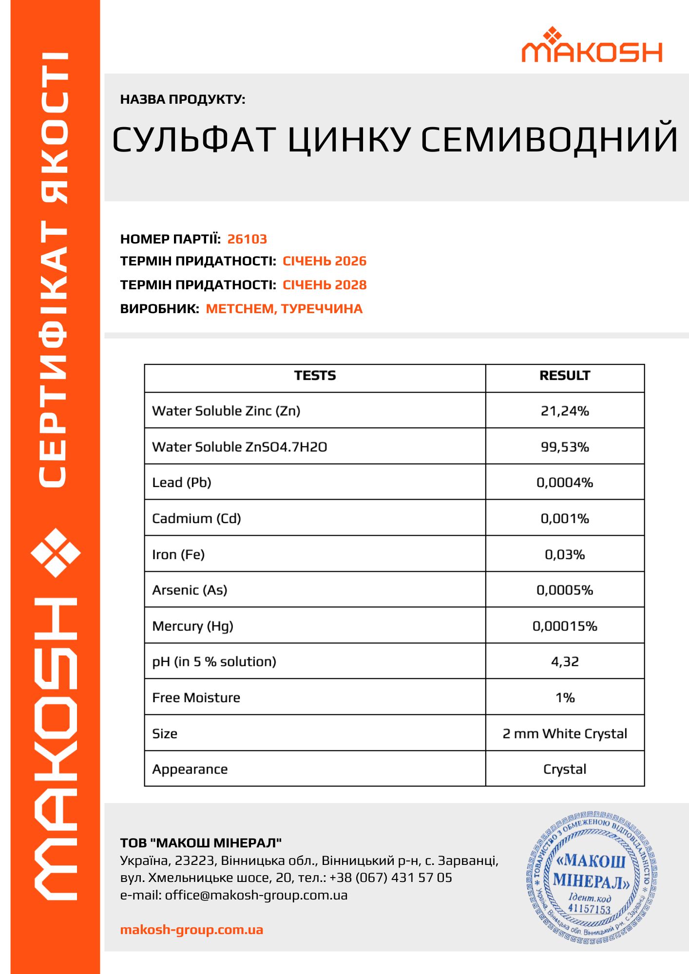 • Оптимальне джерело цинку для рослин. Сульфат цинку швидко розчиняється, забезпечуючи повноцінне засвоєння поживних речовин, особливо для культур, чутливих до його дефіциту.