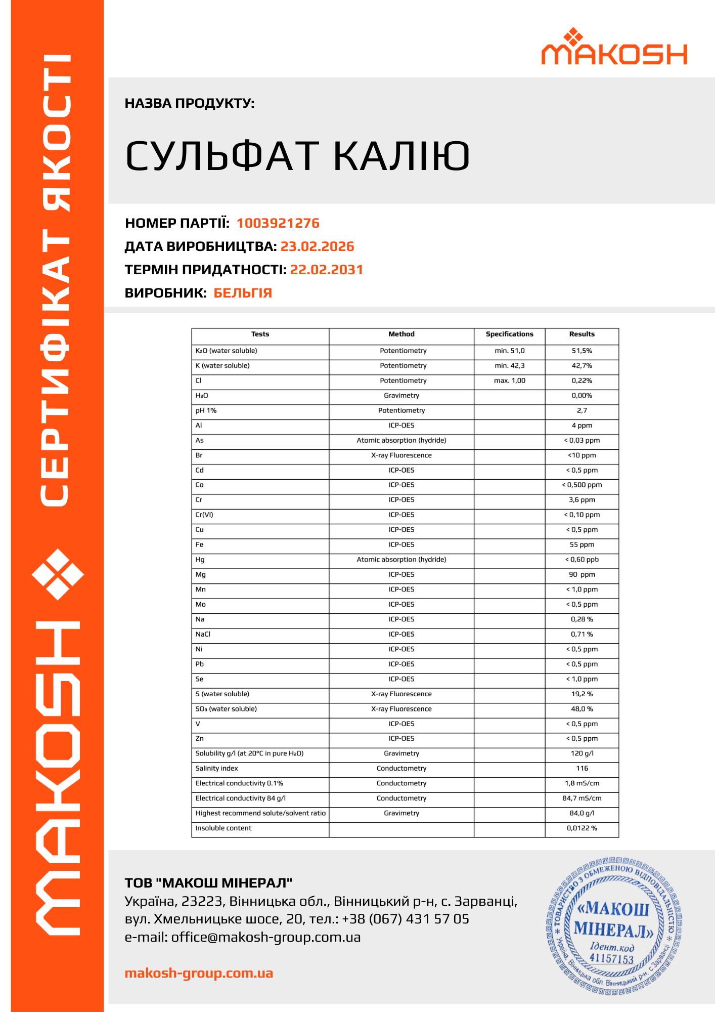 - Бесхлорная сульфатная форма калия — максимальная доступность. Благодаря высокой растворимости, удобрение обеспечивает быстрое усвоение калия и серы, улучшая питание растений без риска токсичных воздействий.